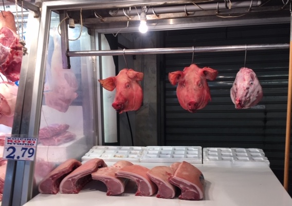 Petros Markaris pinta la zona entre Monastiraki y Omonia como de inmigrantes y droga. Efectivamente, detrás del mercado central con su «sala de la carne» bastante pintoresca (os mando una foto de la sección porcina) hay una serie de calles con nombres de los grandes exponentes de la civilización griega (Menandro, Sócrates, Sófocles, plaza del teatro, etc.) que están ahora vacías de griegos y abarrotadas de inmigrantes orientales. El teatro por ejemplo está quemado desde hace tiempo, pero no parece que lo vayan a arreglar. Hay bazares chinos a mogollón y cantidad de hindúes y asimilados que llenan las calles, al menos el sábado por la tarde que fui a visitar la zona. Además el trapicheo es descarado. Me ofrecieron algo pero como no entiendo griego pues no me atrevía comprar, y ni siquiera a sacar el móvil para echar unas fotos del ambiente, por si acaso. El conjunto es bastante sórdido y no lo recomiendo a las señoras (yo fui solo), pero no es muy extenso. Omonia ya es un caos de tráfico y la presencia de inmigrantes se diluye bastante en el barullo general.