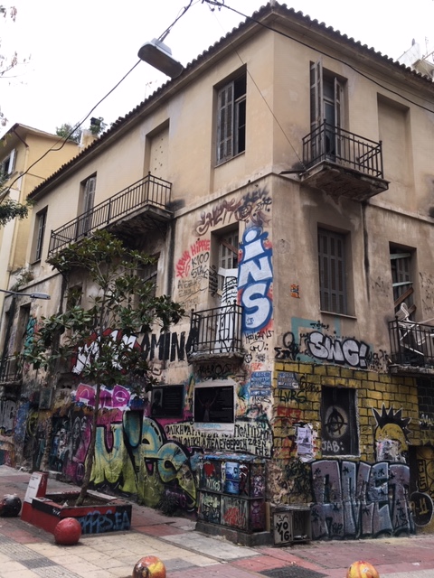 Siguiendo por la calle Skoufa, llega un momento en que se pasa por delante de la Universidad de Atenas (Panepistemio Athinon), con la fachada llena de carteles, grafitti y suciedad en general. Se nota que allí reina el alumnado, poco motivado para el «orden y progreso» de Compte y más para la protesta y la polémica, en nuestra acepción claro, pues tenemos cerca de casa el «Polemiko Museio», que es el museo de la guerra. Los estudiantes no llegan a tanto. La manzana siguiente al Panepistemio es ya zona Okupa, con basura y ruinas bastante abundantes, aunque decoradas con grafitti anticapitalistas y revolucionarios. Os paso una foto del sitio.