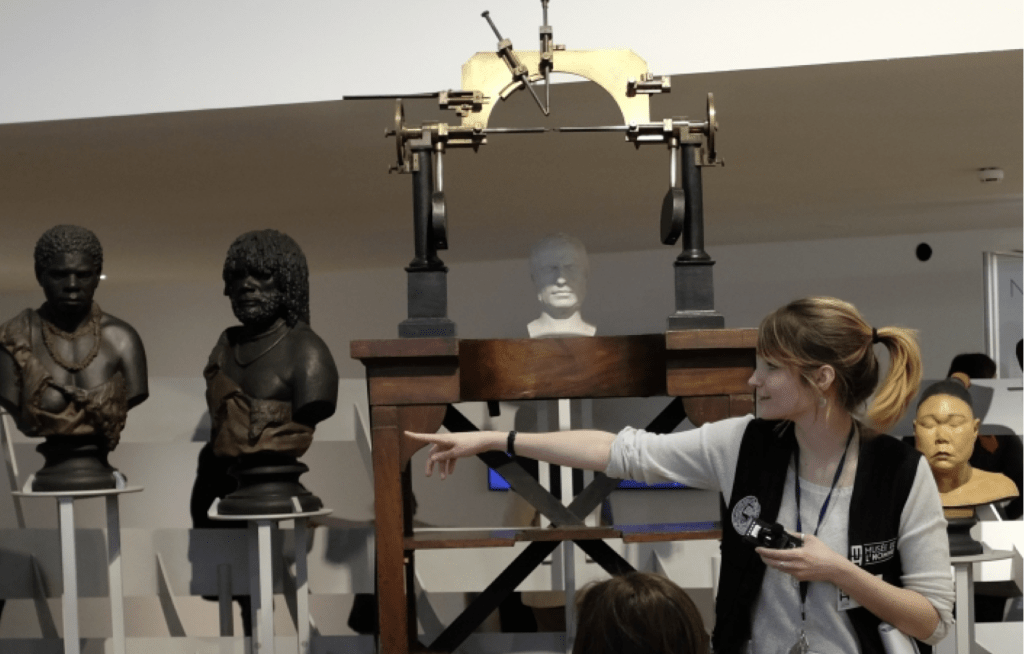 Aun quedan algunas cosas de antes como los 91 bustos de yeso o bronce que representan la variedad de la humanidad, hechos con esta máquina de medir cabezas que os adjunto. La cabeza de la rubia no está expuesta.