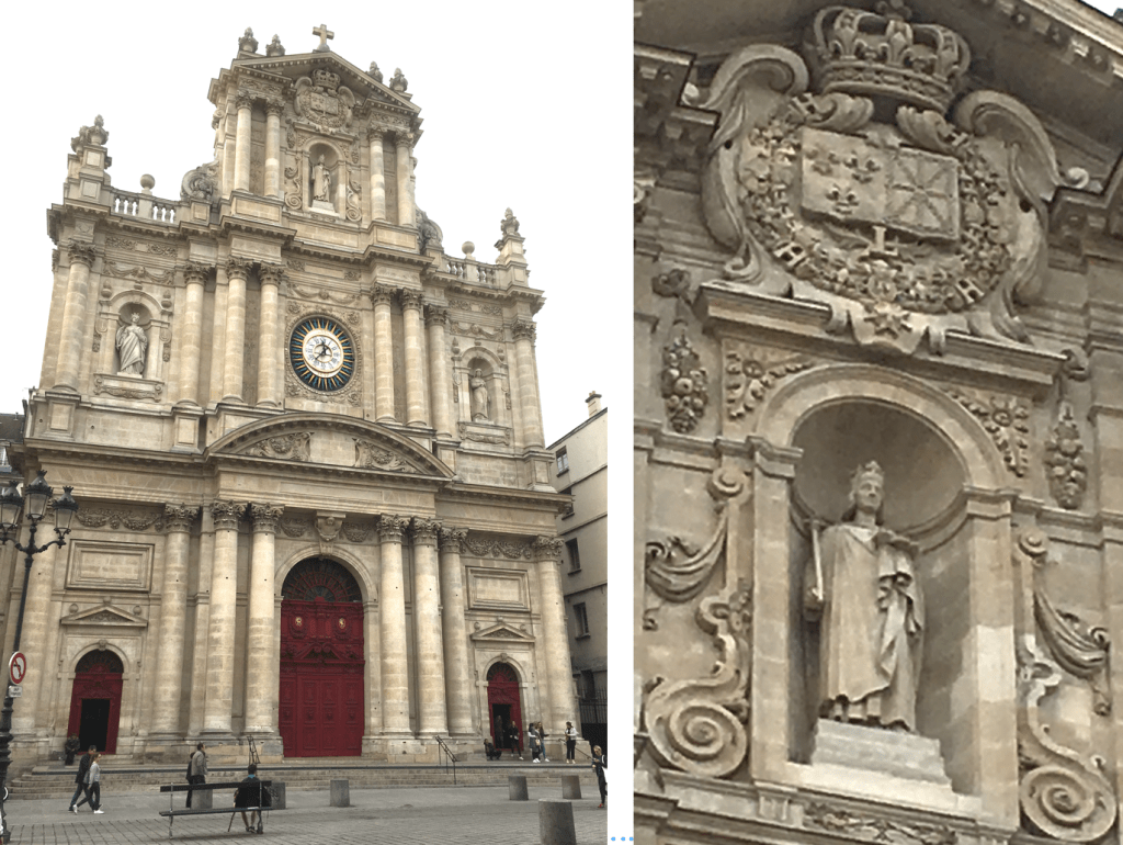 – Saint Paul Saint Louis, anteriormente conocida como iglesia San Luis de los Jesuitas. Está situada junto al Metro St. Paul, al sur del Marais (4º distrito). Está pegando al liceo Carlomagno, que era la antigua casa de los jesuitas en París. Como curiosidad, en su fachada tiene, sobre la estatua de San Luis, rey de Francia, las armas de los borbones, que constan de las tres flores de lis típicas, al lado del escudo de Navarra con sus cadenas (que traería Enrique IV, el de “París bien vale una misa”), como se ve en la ampliación de la foto.