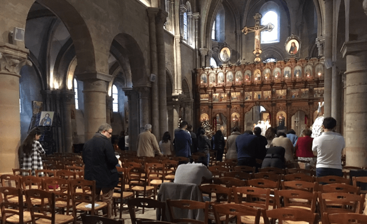 – Saint Julien le pauvre, así llamado porque San Julián andaba siempre a la última pregunta por lo dadivoso que era con los necesitados. Está situada en el Square René Viviani, justo en el otro lado del río de Notre Dame y muy cerca de la Librería Shakespeare and Company (también interesante de visitar, junto a los “bouquinistes” de la rive gauche). Es una iglesia muy pequeñita pero muy antigua, de rito malakita griego, con su cura dando la espalda a los fieles y el iconostasio típico de los templos ortodoxos, aunque es católica (os paso una foto en plena misa). En el jardín del Square está, además, el árbol más antiguo de París.