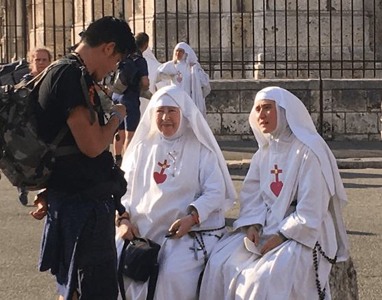 Monjitas conversando con un joven peregrino