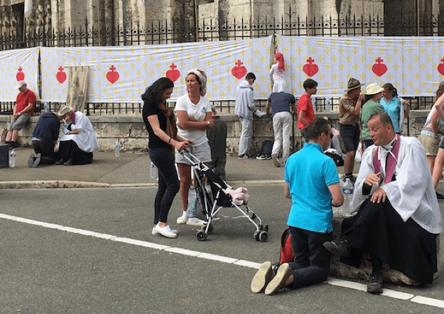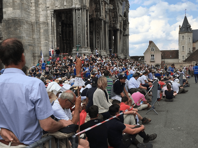 Pues bien, aquél lunes la villa estaba tomada por una muchedumbre de peregrinos que habían venido andando desde Paris (≈ 80 km) a celebrar el Pentecostés. Ahí comprobamos que la minoría católica es muy activa en Francia. Vimos escenas de fervor desatado, con gente confesándose de rodillas en la plaza, el Cardenal Robert Sarah oficiando la misa en presencia de las reliquias del Padre Pío, curas jóvenes, todos con sotana, monjitas jóvenes y no tan jóvenes, incluso un sacerdote gótico con la cabeza rapada, parte de la sotana de malla semitransparente, tatuajes, pendientes en forma de cruz, bolso de cuero negro con tachuelas, y demás. Se oía hablar bastante español entre la multitud, pero la inmensa mayoría eran gentes de Francia, claro. Había también bastantes grupos Scout. Tras la ceremonia religiosa coincidimos en el mismo bar con el cardenal, que estaba tomando unas cervezas y descansando después del oficio, rodeado por su “séquito” de sacerdotes. La peregrinación tenía, eso sí, un excelente servicio de orden y limpieza. Al acabar los actos, Chartres quedó limpio como una patena (nunca mejor dicho).