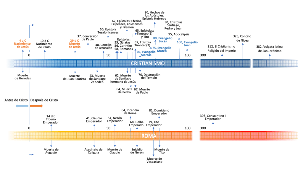 La falta de originales no ha impedido, sin embargo, datar aproximadamente los libros del Nuevo Testamento (no sin discrepancias entre los expertos) por los hechos relatados y las referencias a gobernantes o acontecimientos paralelos que se mencionan. Da la casualidad que tenía por casa la: “Guía de la Biblia: Nuevo Testamento” escrita por Isaac Asimov y editada por Plaza y Janés (1998). Esta obra no es del agrado de los académicos, pues Asimov no es historiador y parece ateo por sus comentarios, pero es más asequible a un aficionado como yo. Siguiendo a Asimov, he confeccionado este calendario de escritos del Nuevo Testamento y, acontecimientos paralelos en el Imperio romano, que os presento.