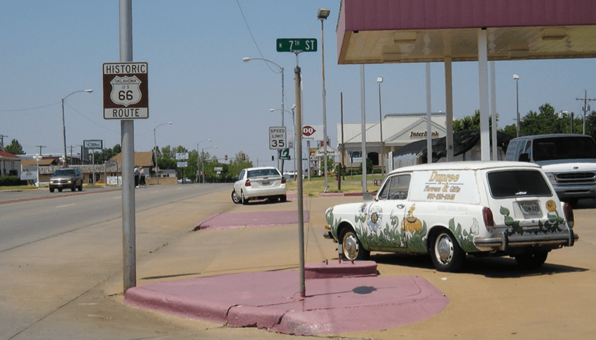 Aunque la mayor parte del camino se hace en la Interestatal 40, hay indicadas zonas de la “Historic Route 66”, donde comienzan a aparecer curiosidades propias de la antigua carretera. Por ejemplo, antes de abandonar Oklahoma, pasamos por Weatherford, sobre la antigua carretera, y Clinton, donde vimos el museo de la Route 66 en (fotos).