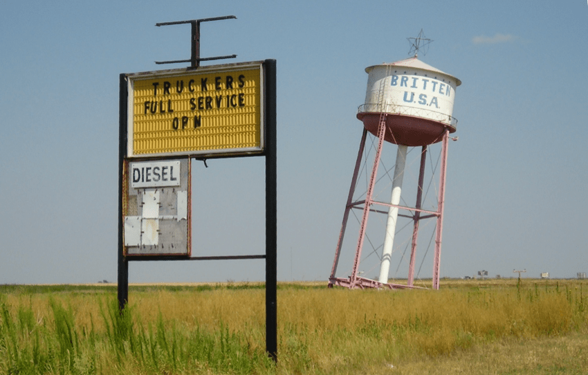 También en Texas hay varias zonas de la Route 66 original, con sus curiosidades. Una famosa es la torre inclinada Britten-USA, en Groom, Texas. La torre era originalmente un depósito de agua que esperaba a ser demolida, hasta que Ralph Britten la compró y la utilizó como publicidad para su estación de camiones y centro de información turística. Después de los daños sufridos en un incendio eléctrico, a mediados de los 1980, solo quedó un pequeño taller local de reparación de camiones. Para 2005 parece que no quedaba ni eso, y el cartel del taller se estaba cayendo (foto).
