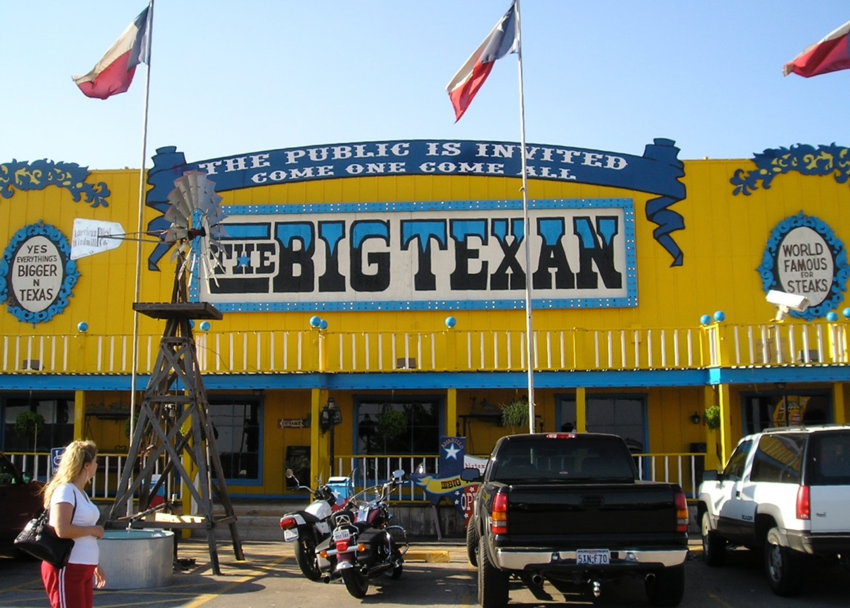 Cenamos en el Big Texan, restaurante famoso por regalarte un filete de 72 onzas (2 kg), si eres capaz de comértelo, con su guarnición, en menos de 1 hora, aunque, por si acaso, te la cobran primero y si lo logras, te devuelven el dinero. Además, te llevan también gratis, en su limusina con cuernos de toro (ver fotos) si te comprometes a intentarlo. El restaurante tiene también un motel adosado, quizá para hacer la digestión, y está en una zona típica llena de moteles de todos los colores, en la misma interestatal 40, a la entrada de la ciudad.