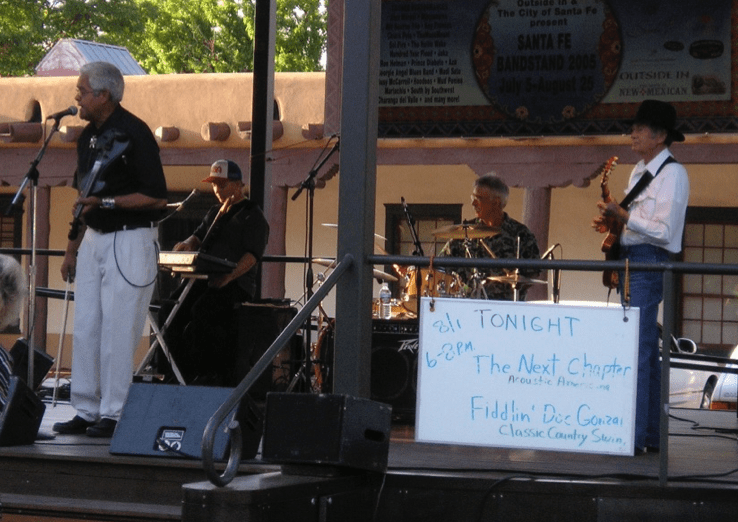 Un grupo de música “Country” actúa en la plaza de Santa Fe. Al fondo el palacio de los gobernadores
