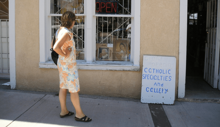 Escaparate de una tienda de Las Vegas (NM) que ofrece “Catholic Specialties and Gallery”, con una foto del Papa Wojtyla (Juan Pablo II), que a la sazón ocupaba la silla de San Pedro