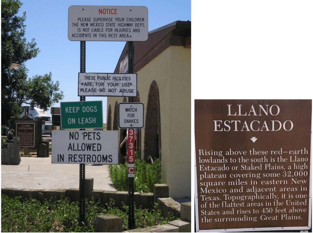 Carteles en un área de servicio al entrar en Nuevo México. Al fondo, se ve un cartel, que hemos ampliado a la derecha, explicando qué es el “Llano estacado”.