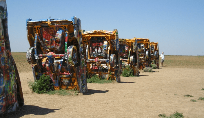 Saliendo de Amarillo por la Interestatal 40 (I-40), encontramos el “Rancho de los Cadillacs”, una de las atracciones más famosas de la R66. Es una instalación creada en 1974 por miembros del grupo de arte “Ant Farm” que consiste en 10 grandes Cadillacs de los años 50 y 60 clavados de morro en la tierra y pintados por grafitis de un colorido rabioso (foto). Según la Wikipedia, los coches se repintan periódicamente de otros colores: una vez de blanco para la filmación de un anuncio de televisión, y otra de negro mate para conmemorar el fallecimiento del artista de Ant Farm, Doug Michels. En 2012 se pintaron con los colores del arco iris para conmemorar el día del orgullo gay, y en junio de 2020, de negro sólido con las palabras «Black Lives Matter» para protestar contra la brutalidad policial y el asesinato de George Floyd, pero al parecer duran poco antes de ser cubiertos de nuevo por grafitis.