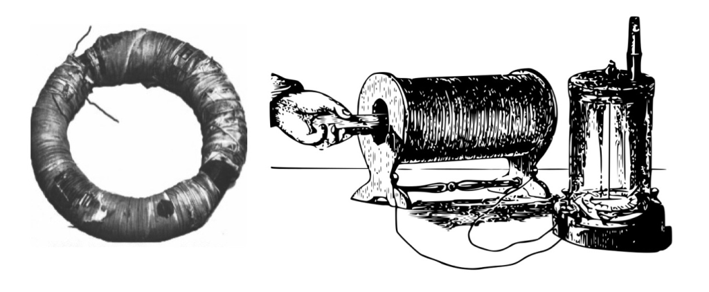 Izquierda: Anillo de hierro original de Faraday con las dos bobinas de cobre arrolladas sobre él, tal como se conserva en la Royal Institution. Derecha: Experimento de la barra de imán y la bobina