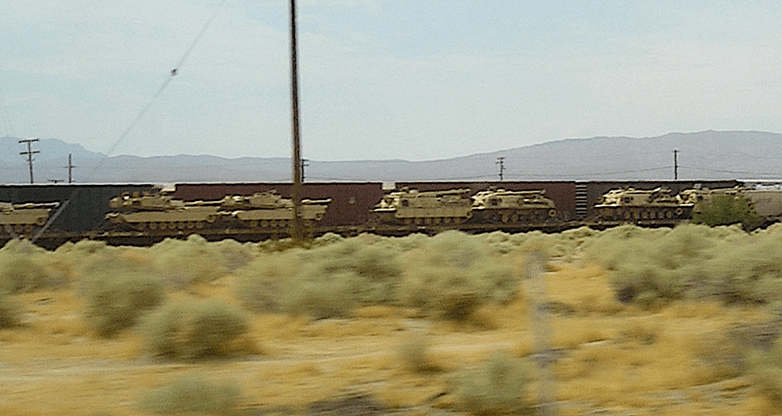 El domingo 7 de agosto de 2005, después de recorrer el strip de día y visitar algunos de los monumentos que no habíamos visto la noche anterior, como el hotel-casino Luxor, el New York y el MGM, salimos de Las Vegas y atravesamos el Mojave, que estaba muy concurrido para ser un desierto. Al parecer mucha gente de Los Ángeles pasa el fin de semana en Las Vegas y vuelve el domingo por la tarde para ir a trabajar el lunes. Por eso la carretera del desierto está llena de gente que vuelve después del fin de semana. Como curiosidad, vimos un gran convoy de tren que iba en sentido contrario a nosotros, llevando blindados en gran cantidad (foto). El Mojave albergó el campo de entrenamiento del ejército para la guerra en el desierto durante la segunda guerra mundial, pero algo debía de quedar pues, por la época de nuestro viaje había sido la guerra de Irak que acabó con Saddam Hussein (a finales de 2003), pero que desencadenó una guerra civil en Irak, a pesar de la celebración de elecciones en enero de 2005. En este conflicto, los blindados americanos tuvieron un protagonismo muy importante.
