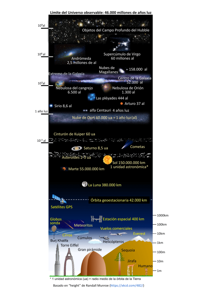 Aprovechando las posibilidades de las escalas logarítmicas, que comentábamos hace una semana, he preparado un gráfico que abarca desde una brizna de hierba hasta el límite del Universo. Está (muy) inspirado en el dibujo de Randall Munroe llamado «height» , que podéis encontrar en https://xkcd.com/482/