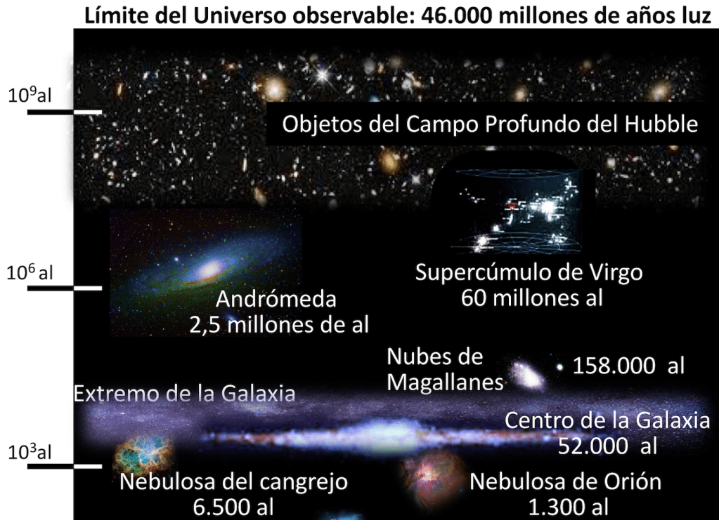 Nuestro mundo cercano en escala logarítmica El límite superior (segundo gráfico, justo debajo) está ya en otra escala, el año-luz (al) que es la distancia que recorre la luz en un año, es decir 9.460.730.472.581 kilómetros. Casi 9 billones (europeos) y medio de km. Abarca desde las galaxias cercanas (Andrómeda) hasta el horizonte del Universo observable, a casi 50.000 millones de años luz.